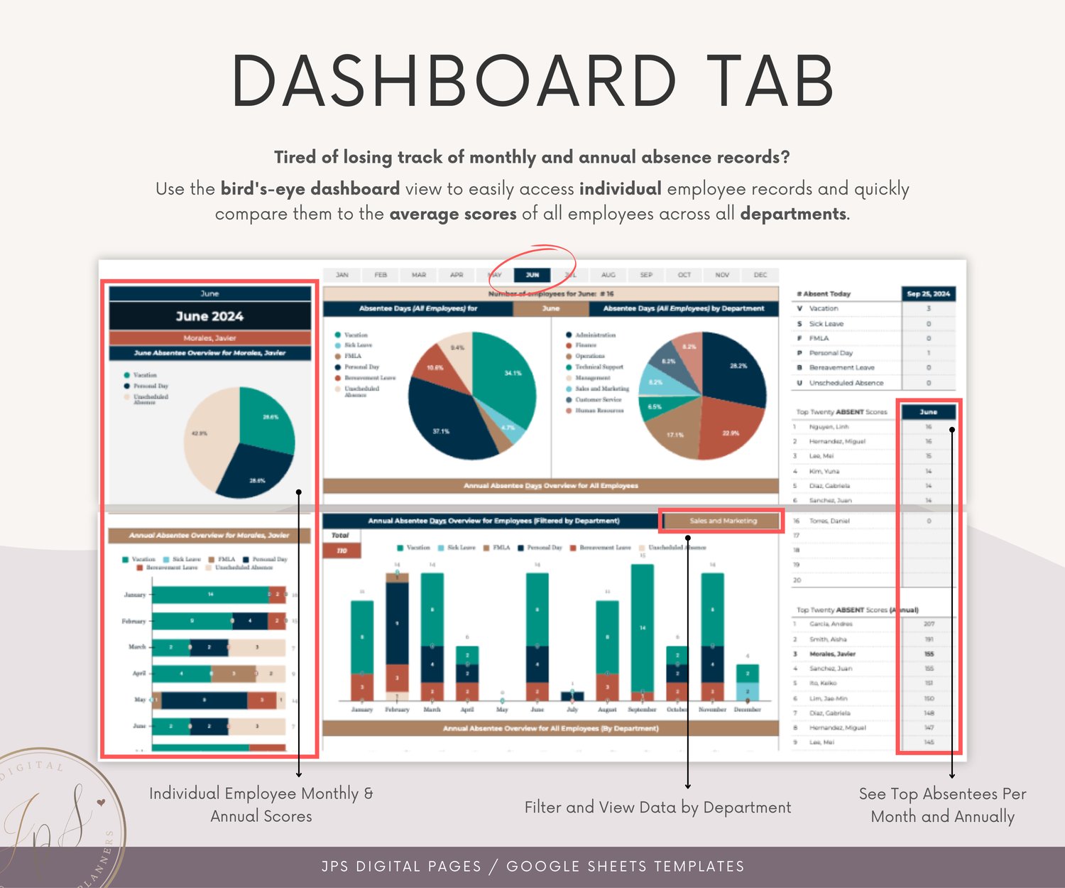 Easily track employee absence for 100+ employees and access a full dashboard that provides real-time insights for both monthly and yearly data.