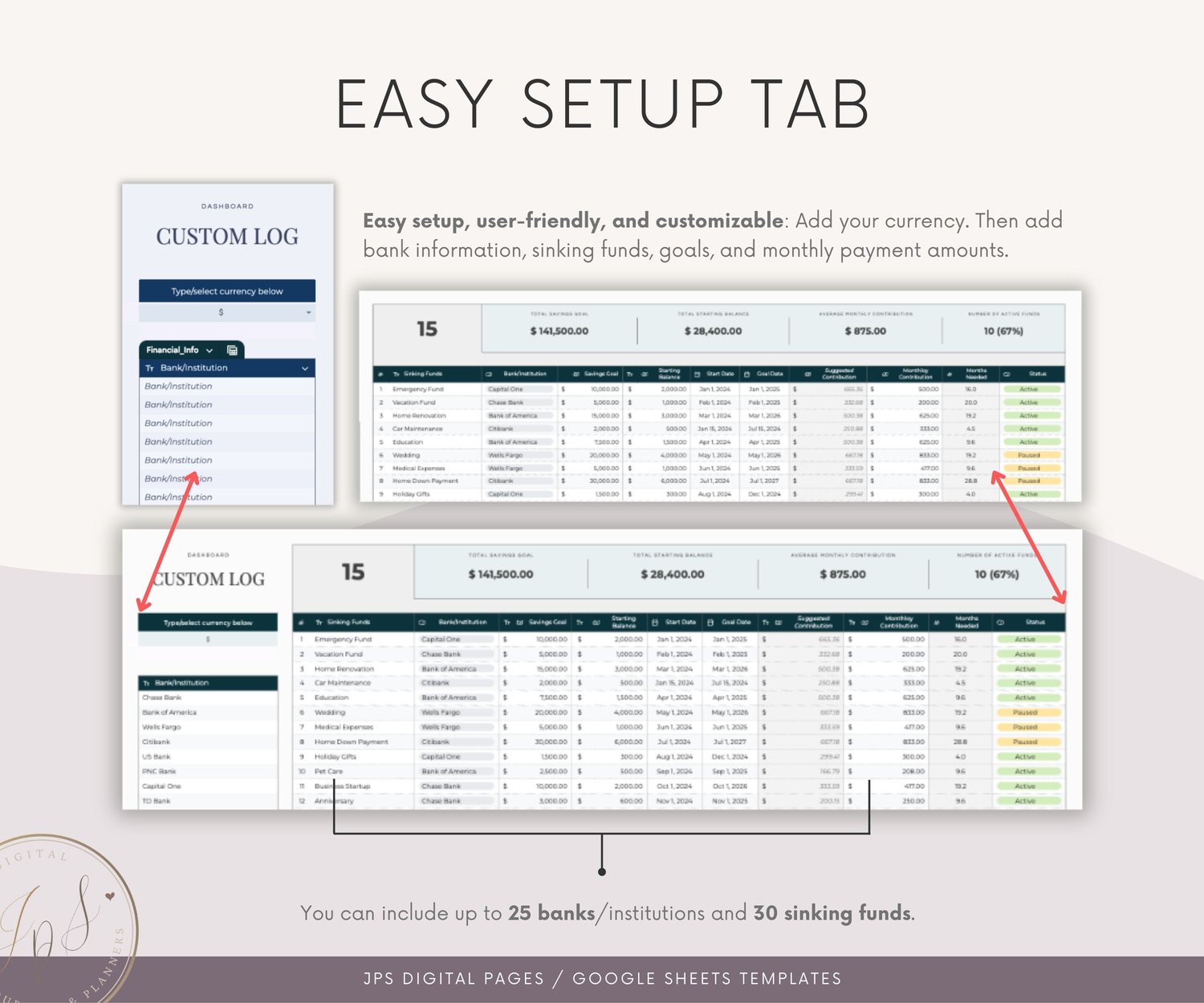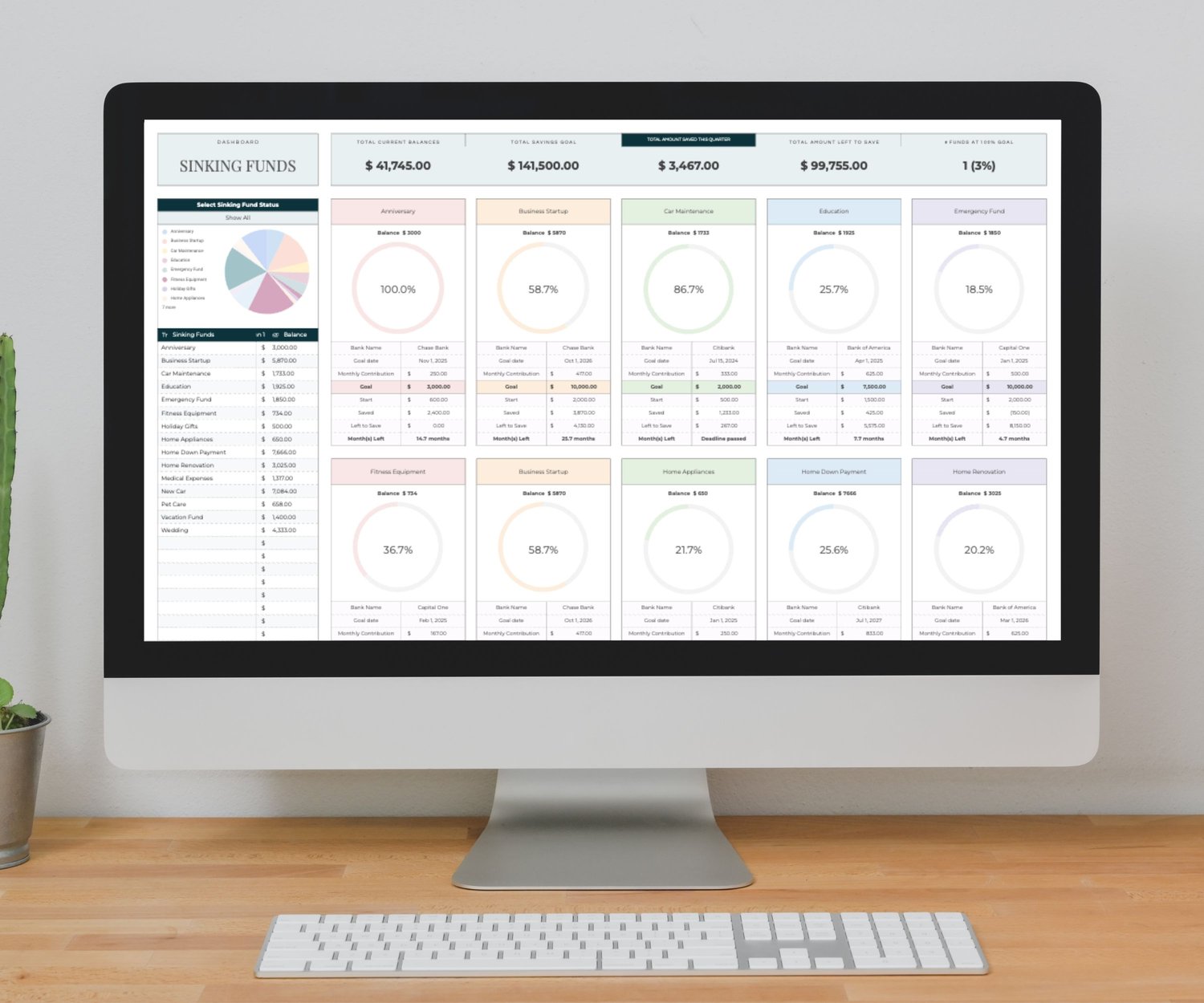 Perfect for managing multiple savings goals, from vacations to emergency funds. Supports up to 25 banks/institutions and 30 sinking funds.