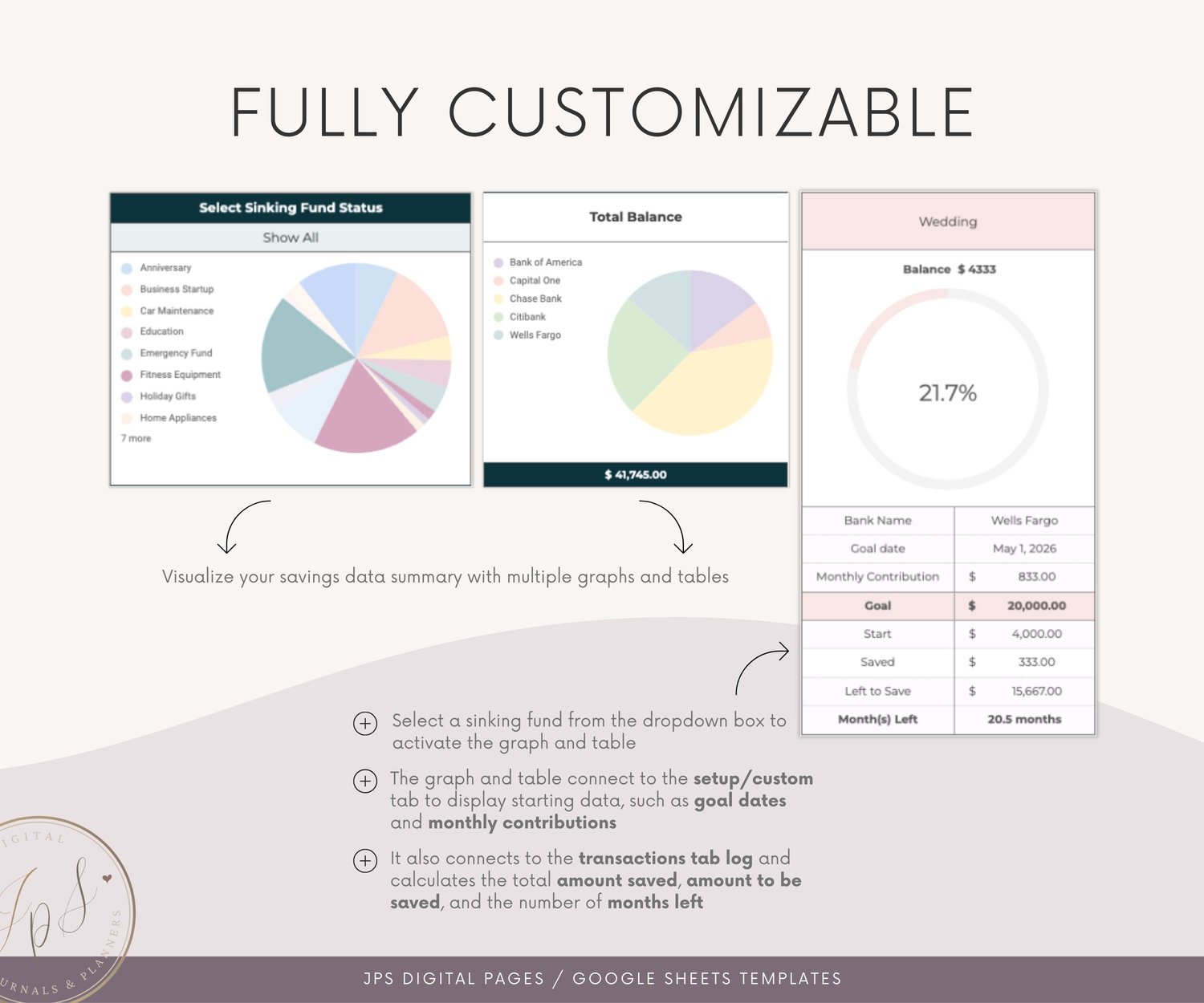 Select a sinking fund from the dropdown box to activate the corresponding graph and table, which connect to your setup tab for accurate goal tracking and to the transactions tab for real-time updates.