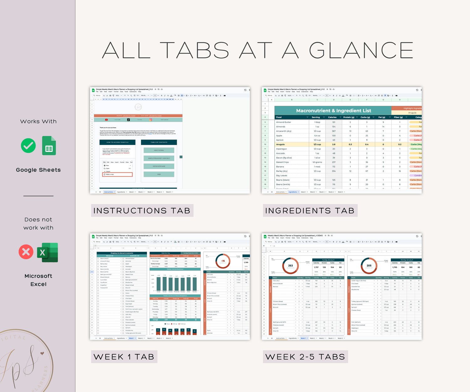 - Weekly Macros Tracker and Meal Planner Tabs (Weeks 1-5): Plan meals, track macros, and generate shopping lists for each week