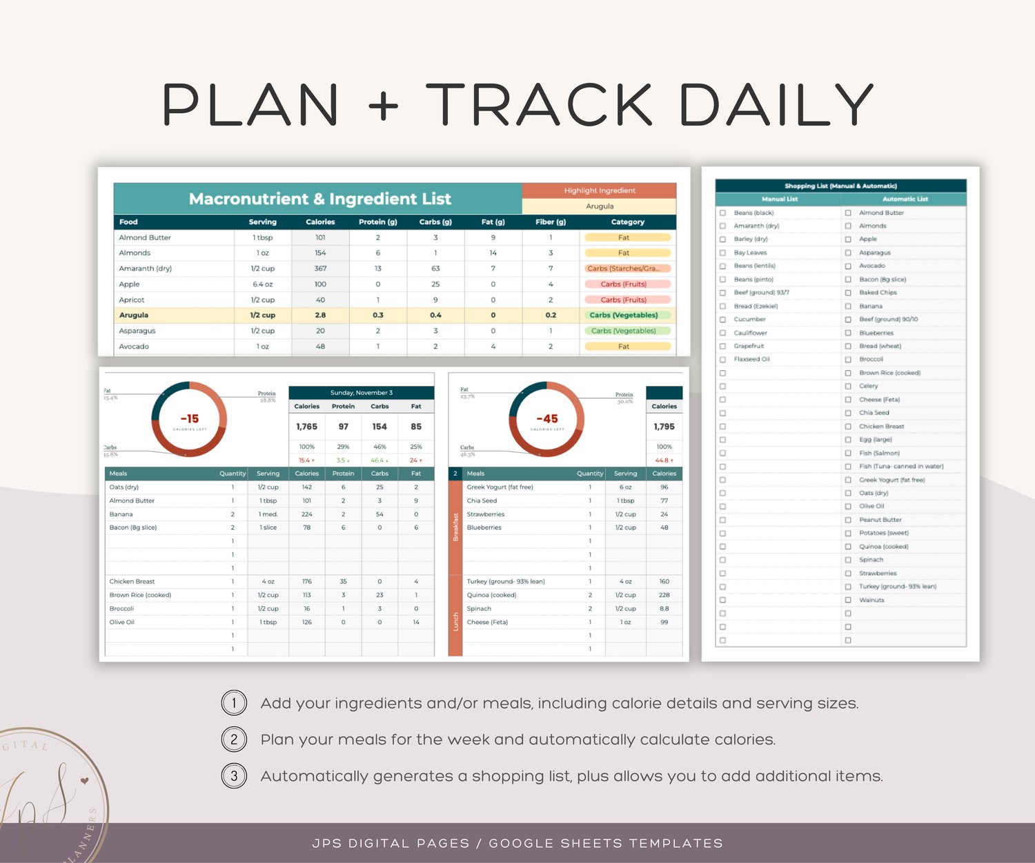 Simplify your meal planning and nutrition tracking with this Google Sheets Template, designed for individuals and families. Track, plan, and calculate your macros and calories for up to 7 days, complete with an automatic shopping list to streamline your weekly grocery shopping.