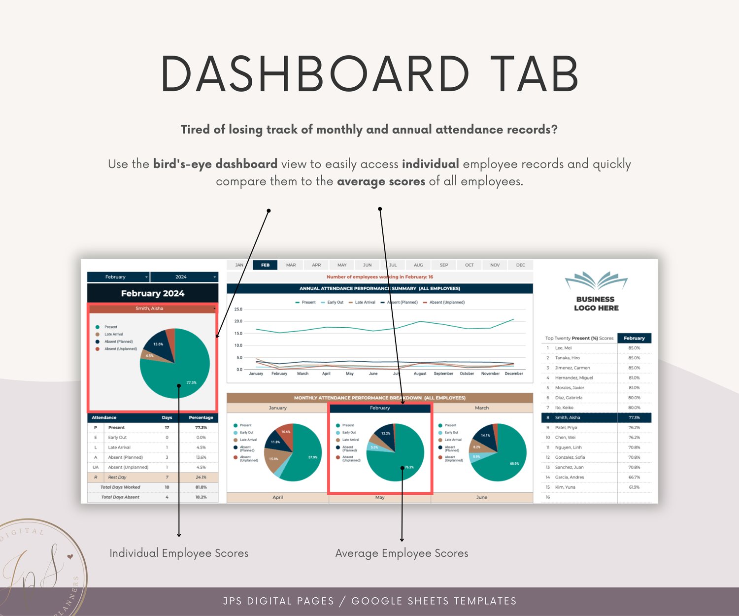 - Quick Access to Key Metrics: Instantly view top employee attendance scores and compare individual records to overall averages.
