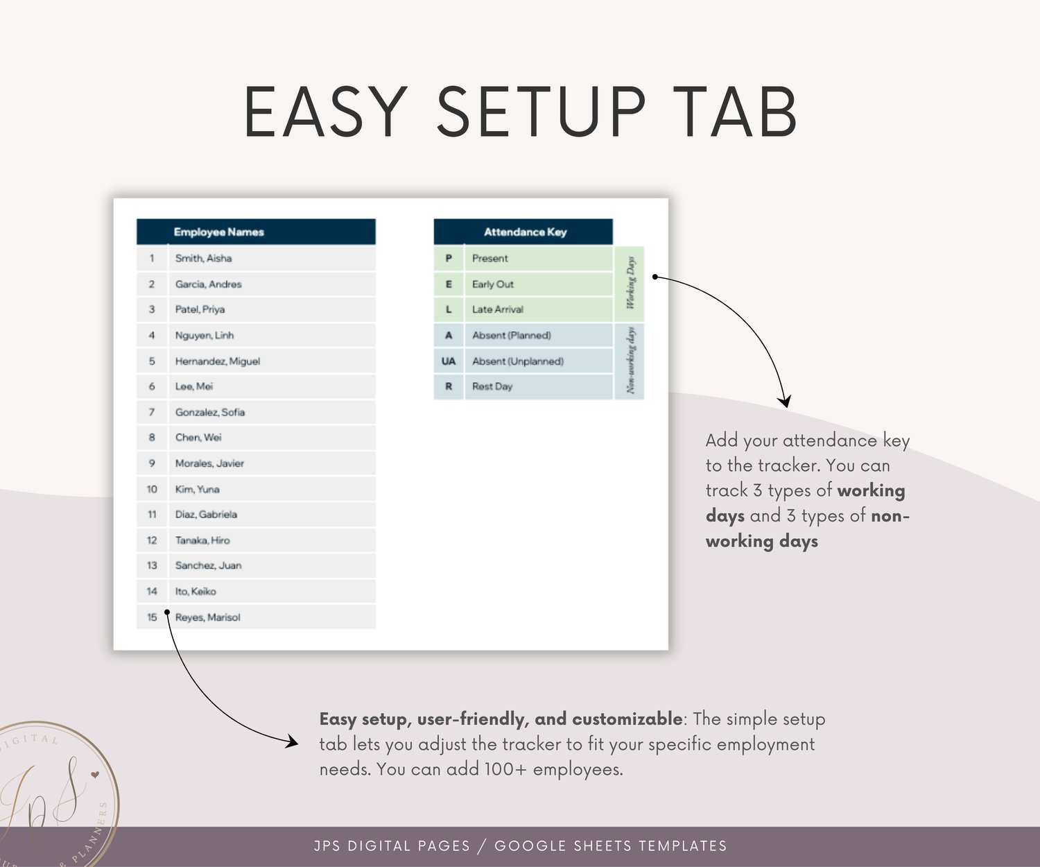 ➤ Setup tab for easy employee data entry with customizable attendance key to match your needs