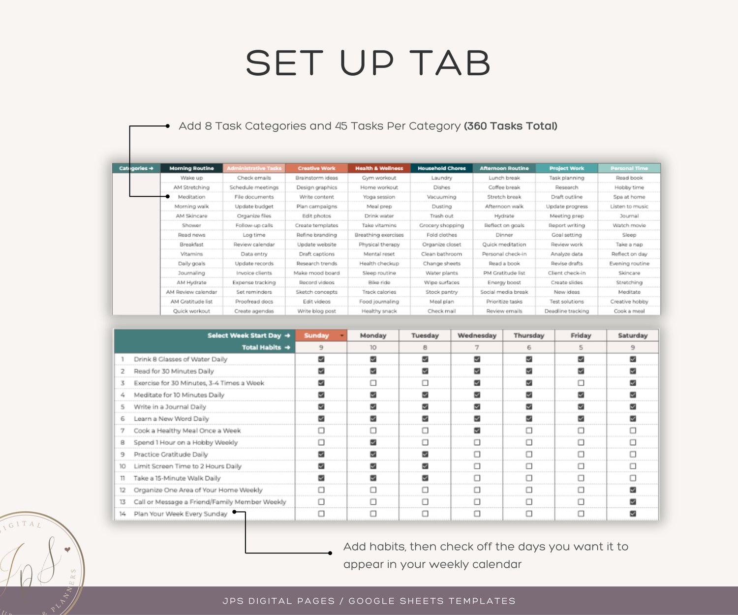 ◦ Customizable Setup Tab: Organize your priorities, categories, and habits.