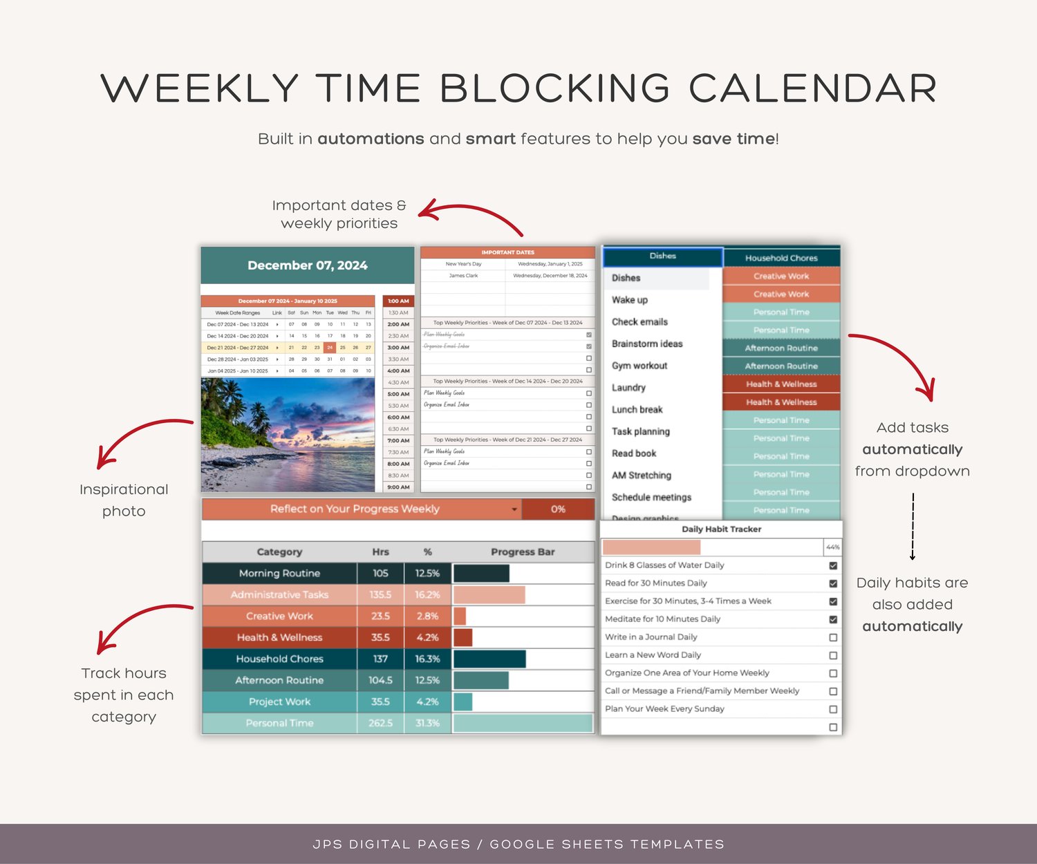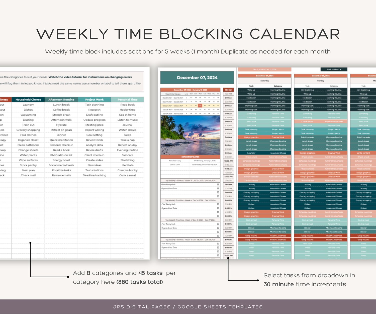 - Weekly Time Blocking Calendar: Organize your tasks visually by week.