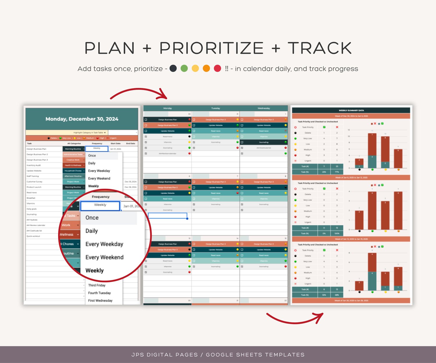 Transform your daily and weekly planning with this fully automated Google Sheets template! Plan, prioritize, and track your tasks with ease.
